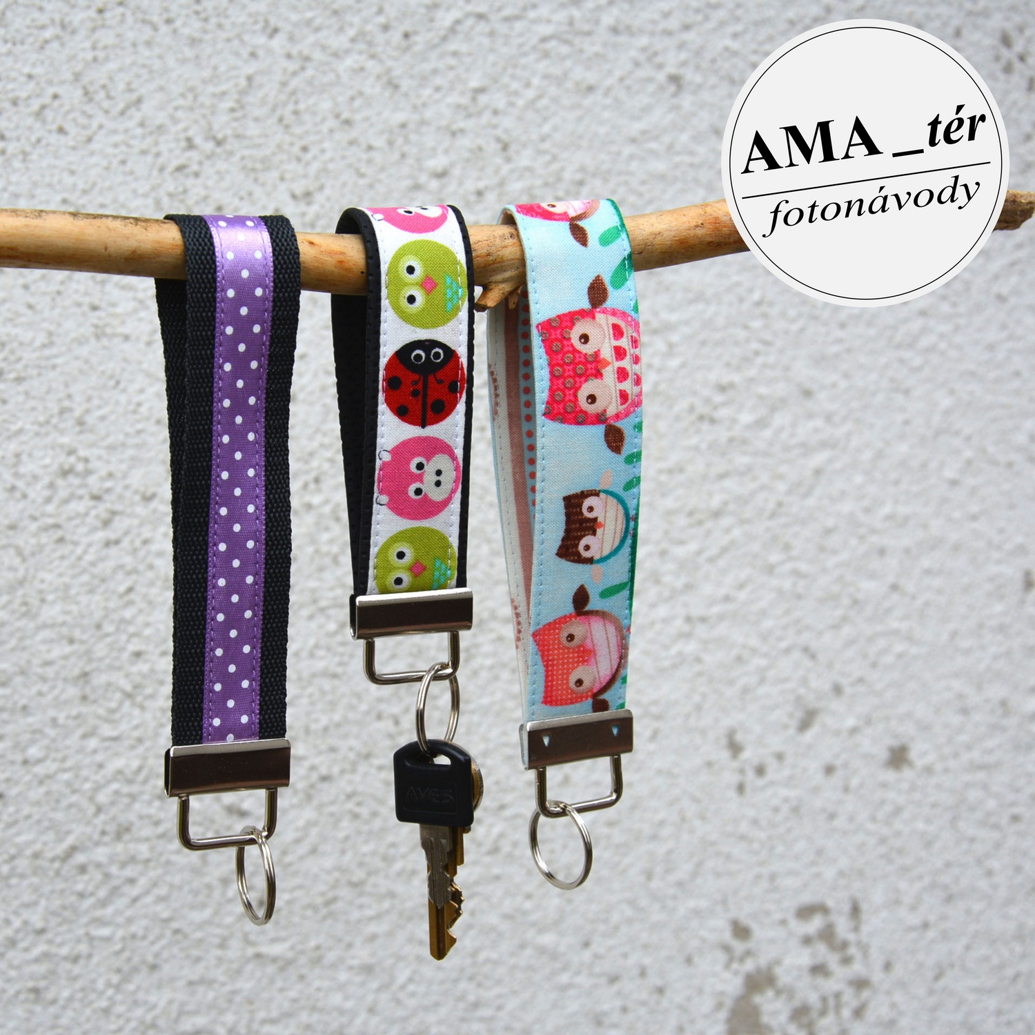 Páskové klíčenky ukončené kovovou koncovkou s očkem a klíčovým kroužkem.